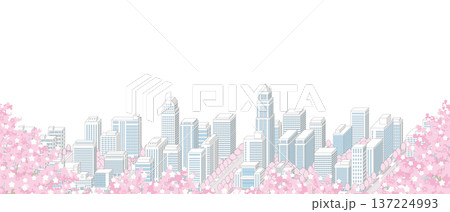 一幅描繪春日城市景觀的插圖,櫻花盛開。