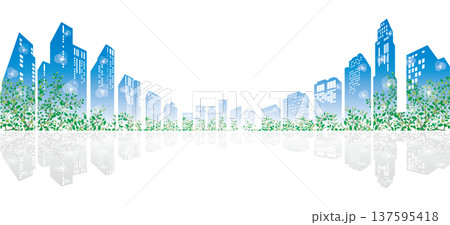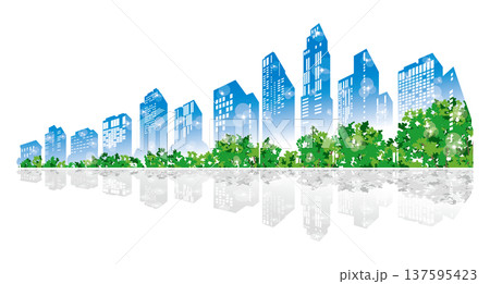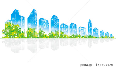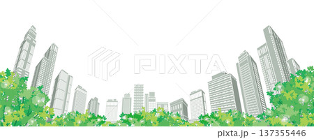 綠建築群扁平化插圖,橫向城市景觀背景素材