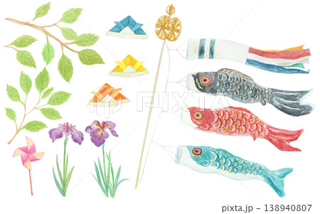 五月主題的水彩插畫,圖案為鯉魚彩帶和鳶尾花。