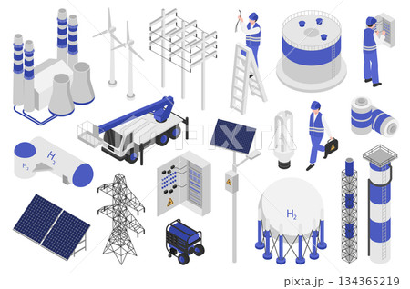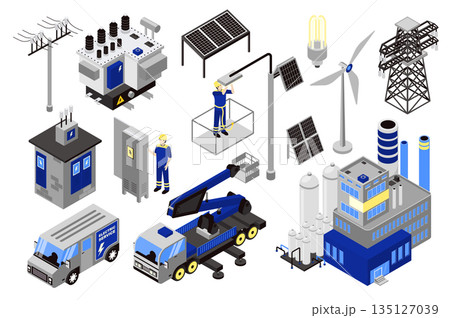 Electrical equipment isometric elements constructor mega set. Creator kit with flat graphic electricians, factory, solar panels, power lines, wind turbines. Vector illustration in 3d isometry design