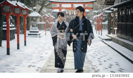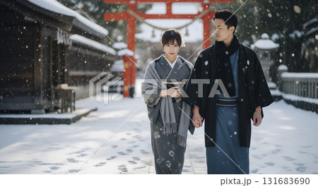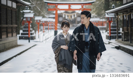 兩人在雪中參拜神社