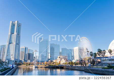 晴朗天氣下的「神奈川縣」橫濱港未來21城市景觀