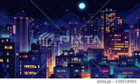 一幅像素藝術插畫,描繪了滿月照耀下的城市夜景,摩天大樓和燈火輝煌的街道以點陣畫法呈現,風格復古。
