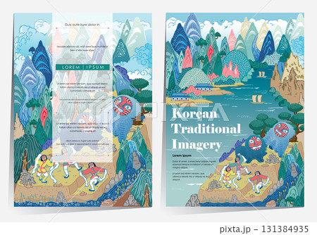 Modern Spirit of Korean Mask Dance in Korean Scenic Nature. Vector Illustration Template set