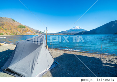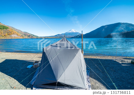 Recreational boats, outdoor park, camping tent, mount Fuji mountain in Japan countryside