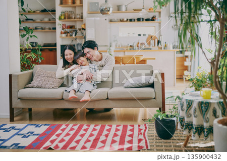一個在客廳裡放鬆的年輕家庭