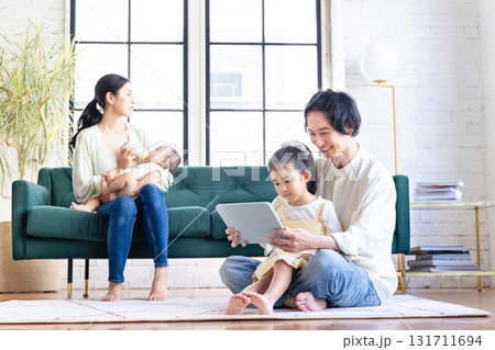 父母和孩子在客廳裡放鬆