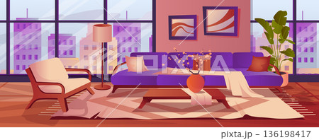 Living room background for banner design. Room interior in modern japanese style with sofa, armchair, table, cherry blossom in vase, lamp, big windows with cityscape view. Vector cartoon illustration