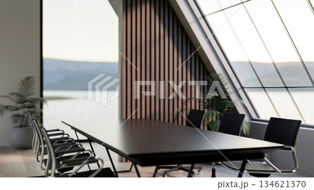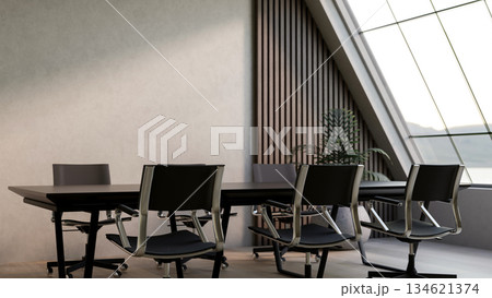 Black long table and swivel chairs with sloped roof window in a meeting room in office or company.
