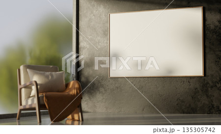 Wooden armchairs and blank frame on cement wall in a gallery room with sunlight through glass wall.