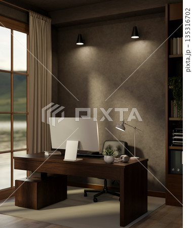 Computer on wooden table and swivel chair in front of a loft cement wall in boss office cabin room.