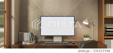 White screen computer on wooden table with book and vase aside loft wall in a bedroom or living room