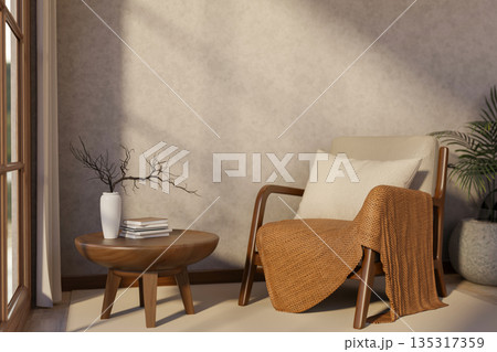 Clean photorealistic living room space soft warm tones simplified environment with blank composition