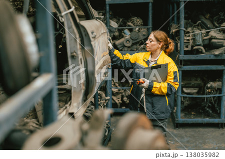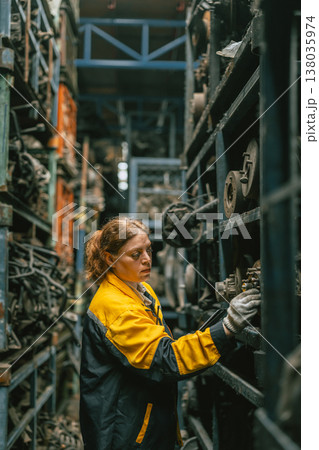 Technician adult women worker working in heavy industry, warehouse manager in garage scrap yard