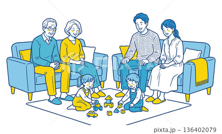 一幅描繪三代同堂家庭在客廳共度時光,孩子們玩積木的插圖。