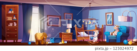 Boys nursery watercolor interior. Baby room design for boy kid, child home furniture newborn bed cot changing table chest of drawers shelf blue wall background vector illustration