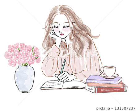 在家工作的女性(羊毛衫,高髻)