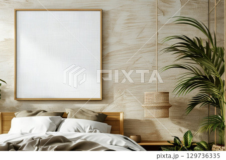 Modern Minimalist Bedroom Interior with Blank Frame on Wall, Cozy Bed, and Natural Light