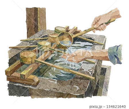 榊系列:一幅寧靜的日式背景畫,描繪了神道祭壇和榊木,以水彩繪製而成。