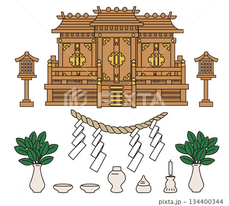 神道祭壇,三神社結構,向量圖 | 神道教,日式風格,吉祥物