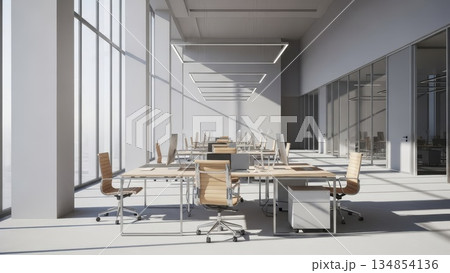 Modern minimalist office workspace with wooden chairs and glass partitions featuring natural sunlight and contemporary design