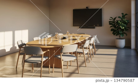 Modern conference room with oval wooden table gray chairs large wall mounted TV screen and fiddle leaf plant in natural sunlight
