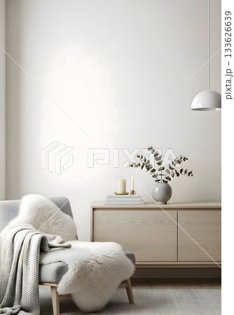 Cozy Hygge Style Living Room Interior with Armchair, Fur Throw, and Minimalist Decor