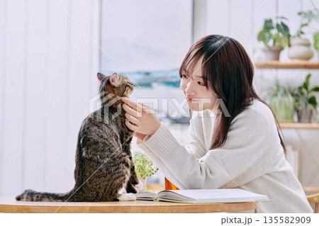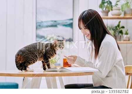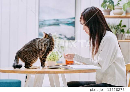 年輕女子在客廳的桌子上和貓咪一起放鬆。