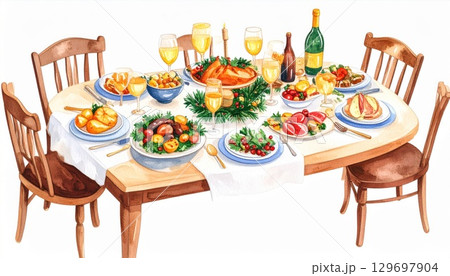 Wedding banquet table set with plates, champagne and lanterns, Hand Drawn Illustration Watercolor