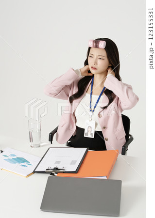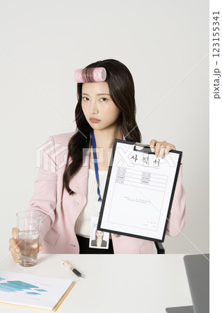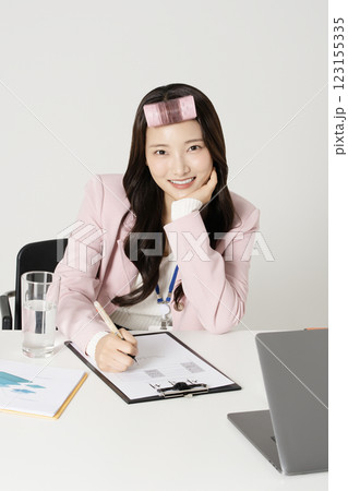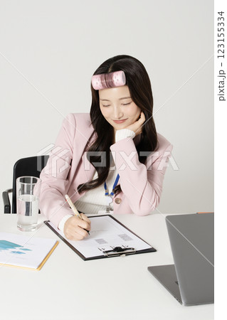 MZ employee sitting in front of a desk with a hair roller and doing calligraphy