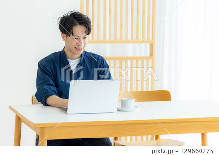 Remote work. Young man studying with laptop and taking notes in a cozy home environment.