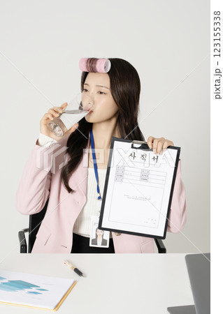 MZ employee sitting at his desk wearing a hair roll and writing a resignation letter