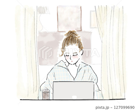 一位綁髮髻的女性正在使用電腦