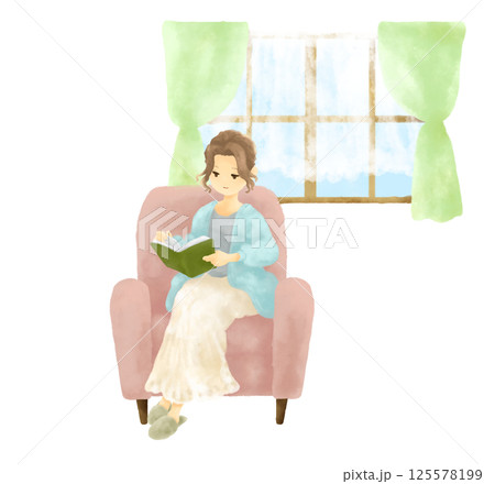一位女士在窗邊讀書的水彩插圖