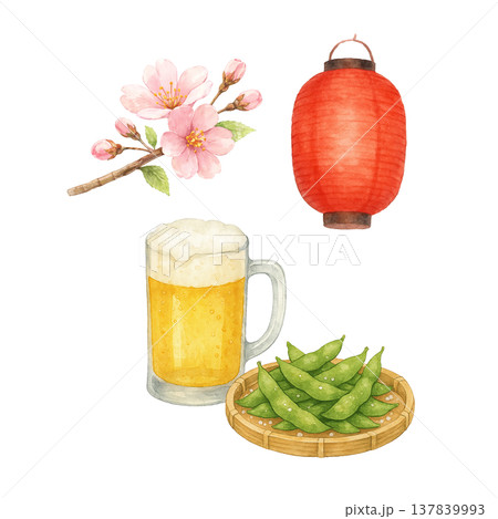 賞櫻、啤酒、毛豆、櫻花、燈籠、春天、居酒屋(日式酒吧)、水彩插畫素材