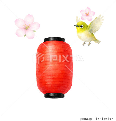 一幅水彩插畫,描繪了一盞燈籠和一隻小鳥,背景是櫻花和充滿春日氣息的日式設計。可愛的裝飾畫,風格簡潔,手繪風格,系列作品之一。