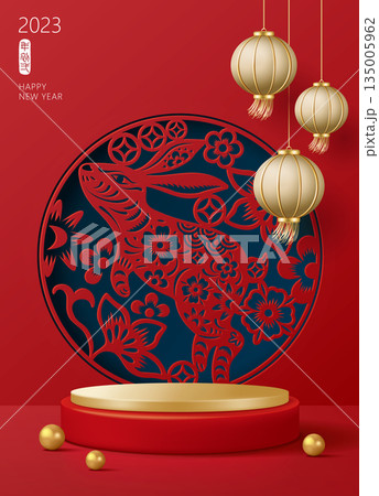 燈籠,兔年剪紙背板及產品展示架,紅色背景,中國風農曆新年或元宵節直郵報告,廣泛發佈公告,數量材料單