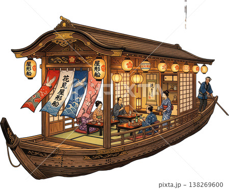 一幅描繪在日本傳統船屋上欣賞櫻花的插圖。