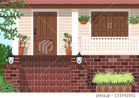 a wooden house with plants on a brick stairway
