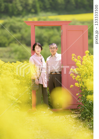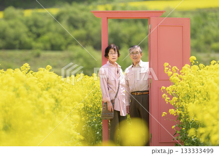 一對老年夫婦在盛開的油菜花田中觀光(高度修圖版)