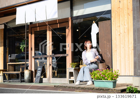一名婦女在咖啡館的露台上工作