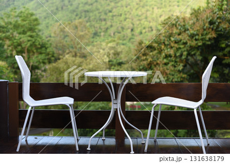 White metal chair on black wooden terrace with blurry lush forest view background