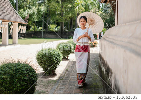A woman in traditional Thai clothing holding a parasol, walking through a temple courtyard surrounded by greenery.