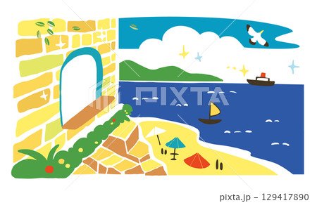地中海建築和大海的簡單插圖