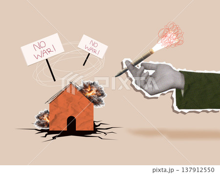 Collage: Anti-war message with burning house and protest signs