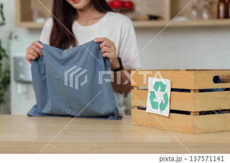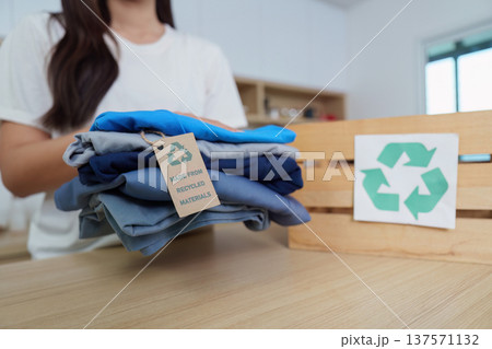 Sustainability. Woman organizing clothes made from recycled materials in eco-friendly lifestyle.