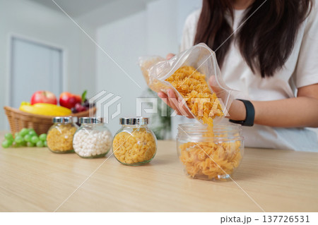 Sustainable Living. Woman pouring pasta into a glass jar for zero waste storage.