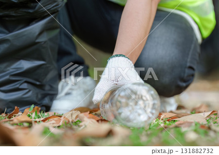 Adult volunteer collects plastic bottles wearing protective gloves clean up plastic waste on green grass outdoor park environmental protection