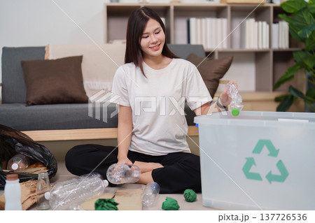 Sustainability. Young woman recycling plastic bottles at home for environmental responsibility.