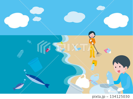 Ocean Cleanup Campaign Illustration Featuring Cleaning the Sea Beach from Trash and Garbage to Restore Nature and Promote Environmental Awareness